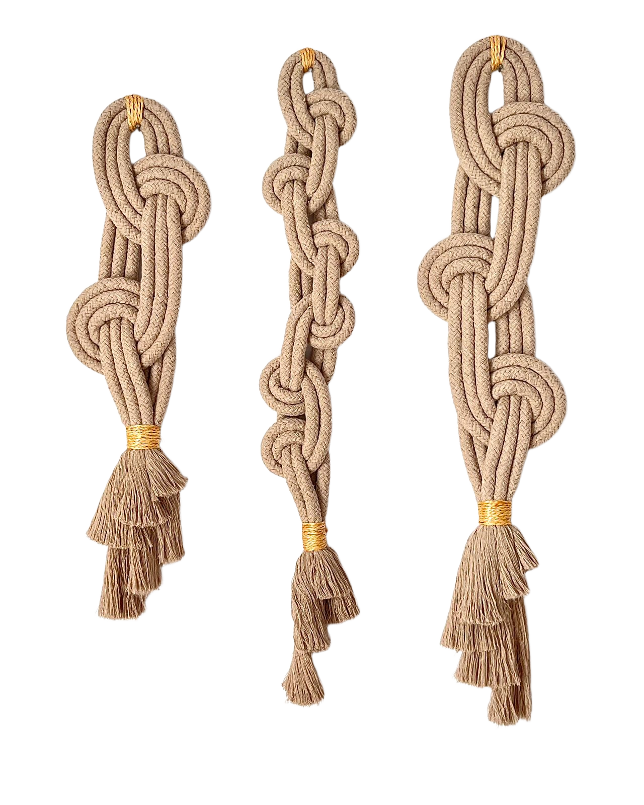 Adorno de Parede Artesanal — Trio Fluid, Flow & Curves Off White em Corda de Algodão e Sisal Dourado