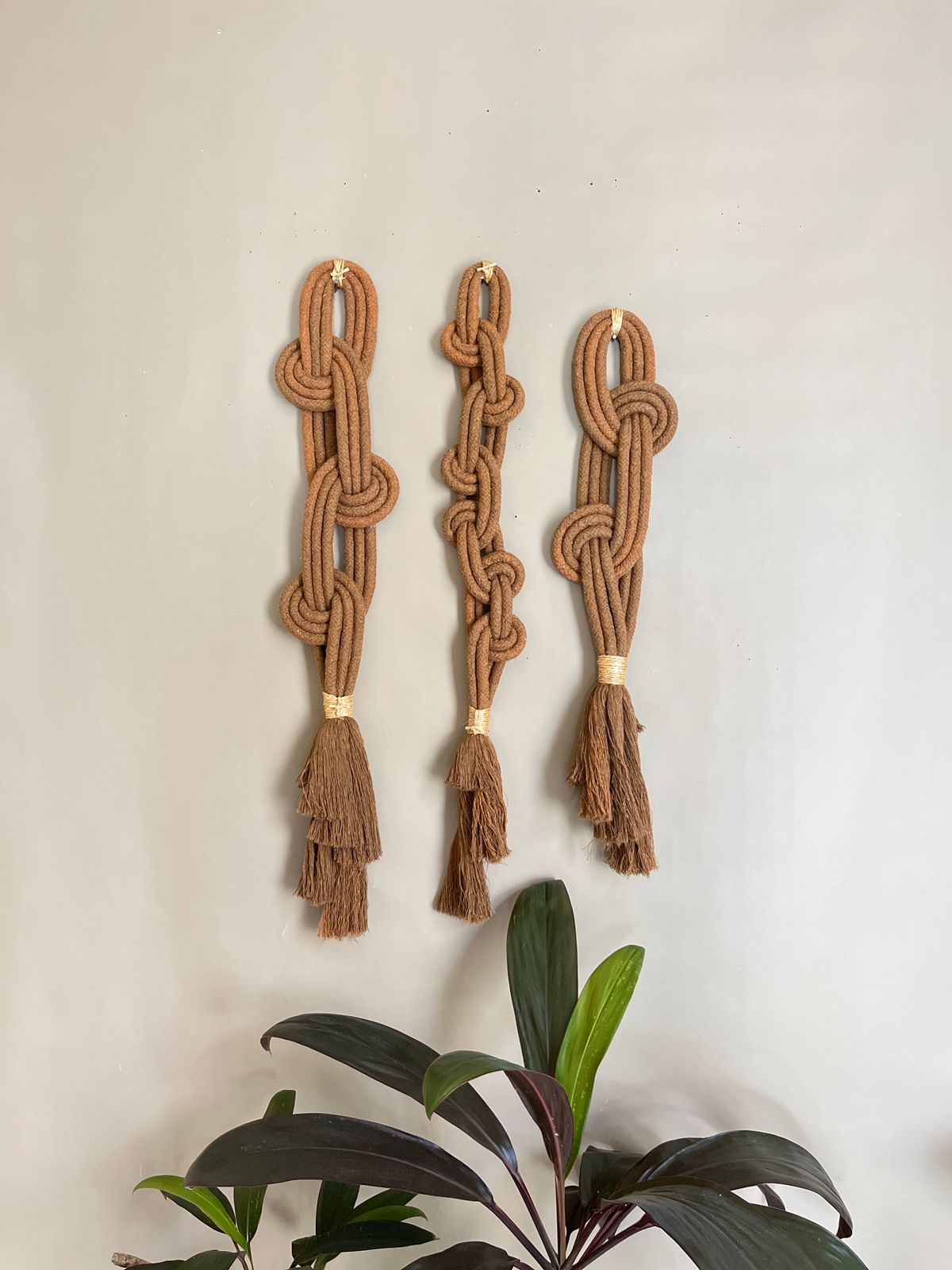 Adorno de Parede Artesanal — Trio Fluid, Flow & Curves Avelã em Corda de Algodão e Sisal Dourado