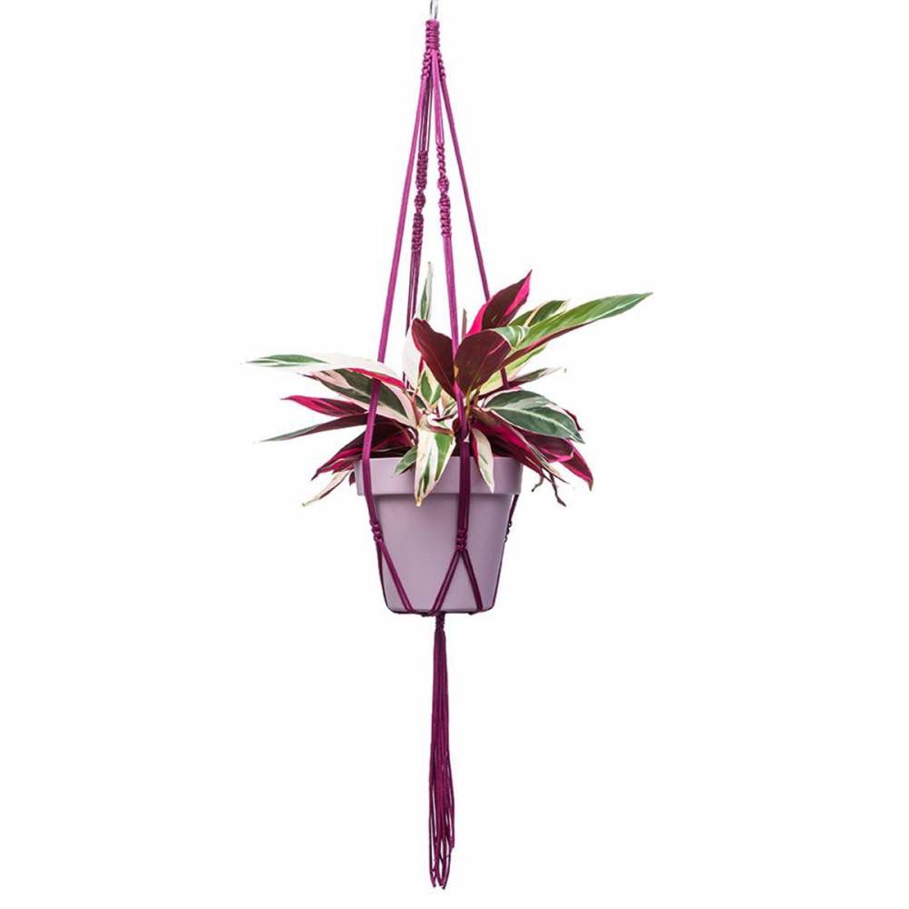 Suporte artesanal para vasos de plantas e cachepots confeccionado com técnica de macramê em cordão de polipropileno.