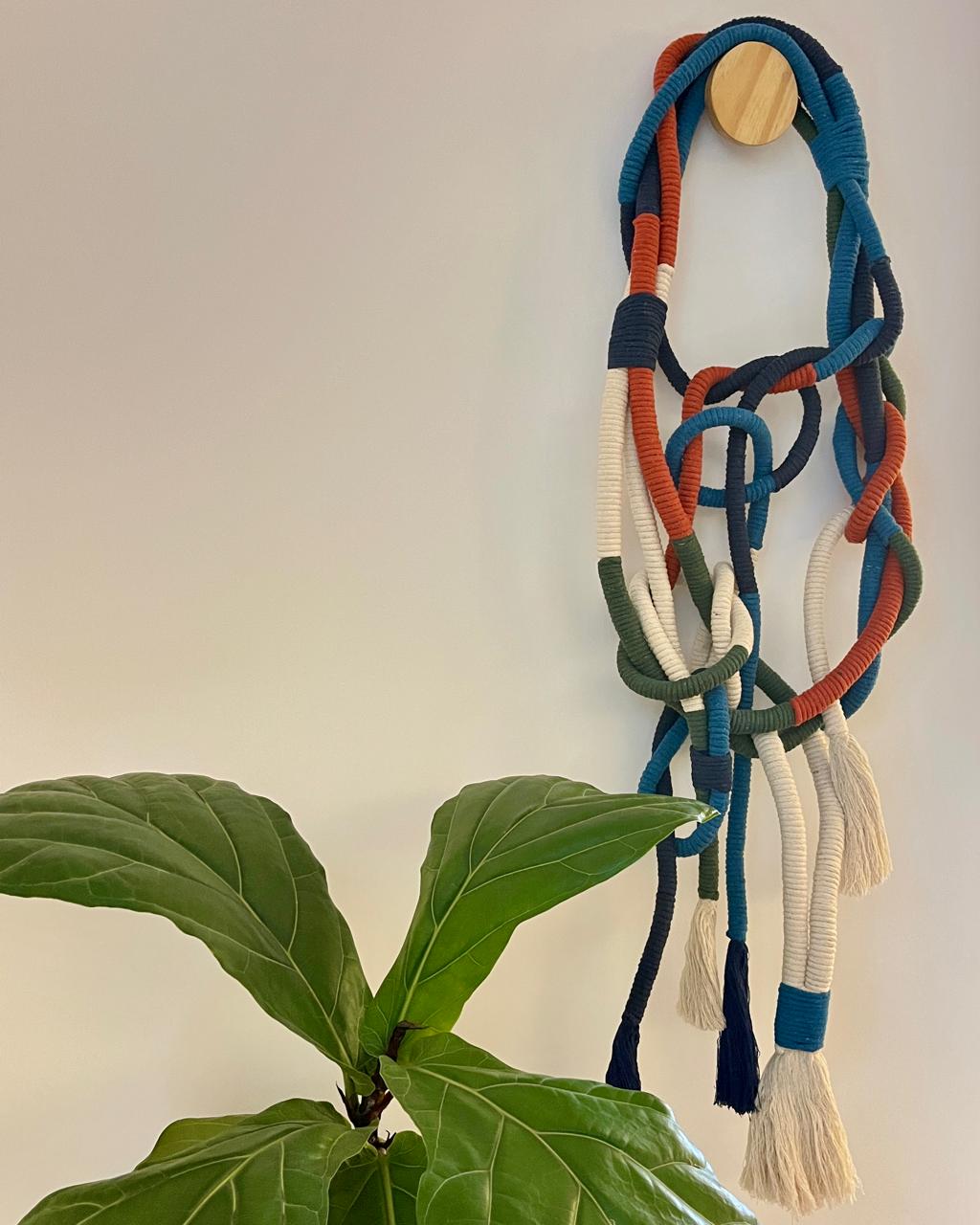 m incrível colar de parede confeccionado com a técnica de macramê em corda de algodão com acabamentos em cordões de algodão. São 12 metros de corda encapsulada resultando em uma verdadeira escultura pronta para ser instalada em um cabide de madeira pinus que também acompanha o produto.