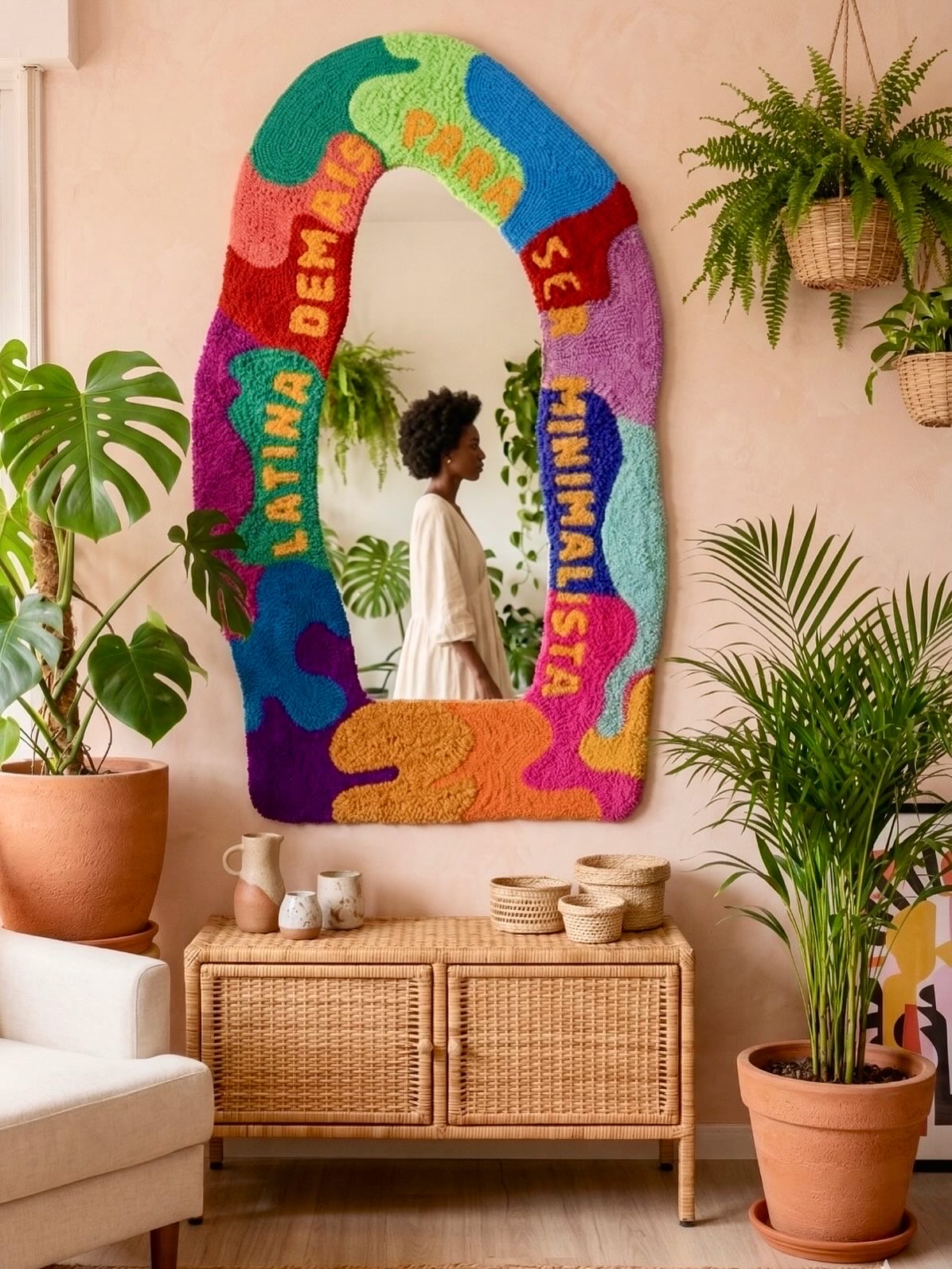 Espelho Decorativo Formato Orgânico 30 cm X 130 cm acabamento na borda com a técnica de fiber art em cordões e elementos de algodão com diferentes texturas e espessuras.