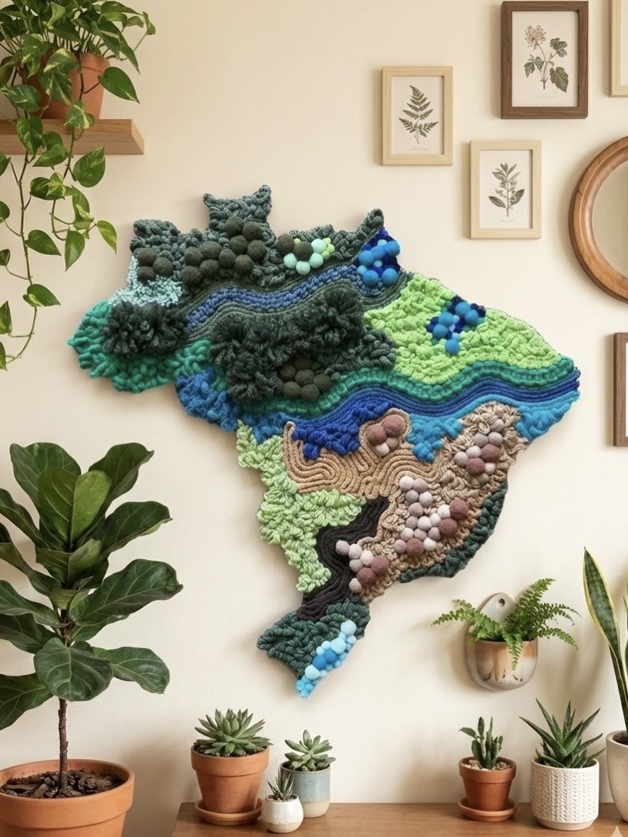 Confeccionado inteiramente à mão com a sofisticada técnica de Fiber Art, cada centímetro deste painel conta a história da nossa diversidade geográfica e cultural. O formato do mapa do Brasil ganha vida através de camadas texturizadas que criam profundidade, movimento e uma experiência visual única. Não é apenas decoração, é arte têxtil contemporânea com propósito e identidade.