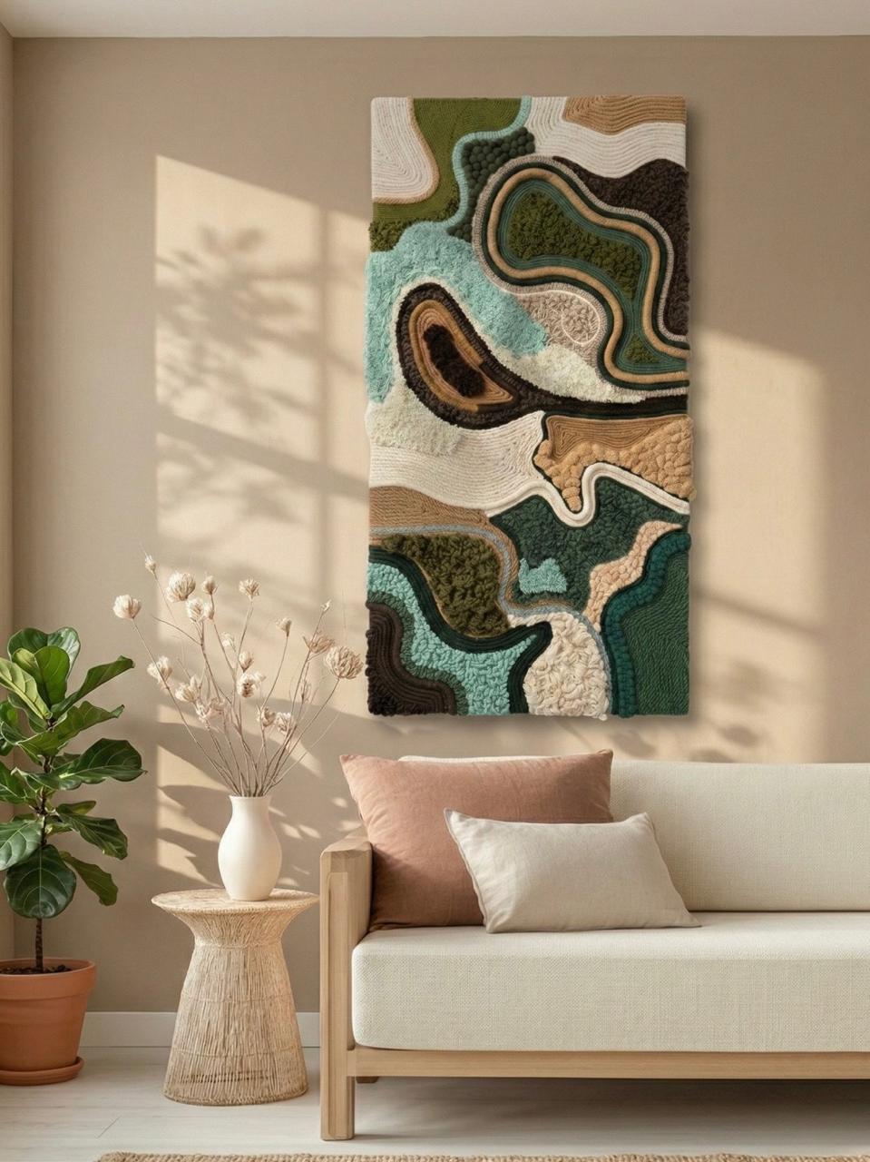 Painel decorativo de parede confeccionado com técnica de fiber art em cordões de algodão com diferentes texturas e espessuras. Se fixado na horizontal também pode ser usado com cabeceira de cama.