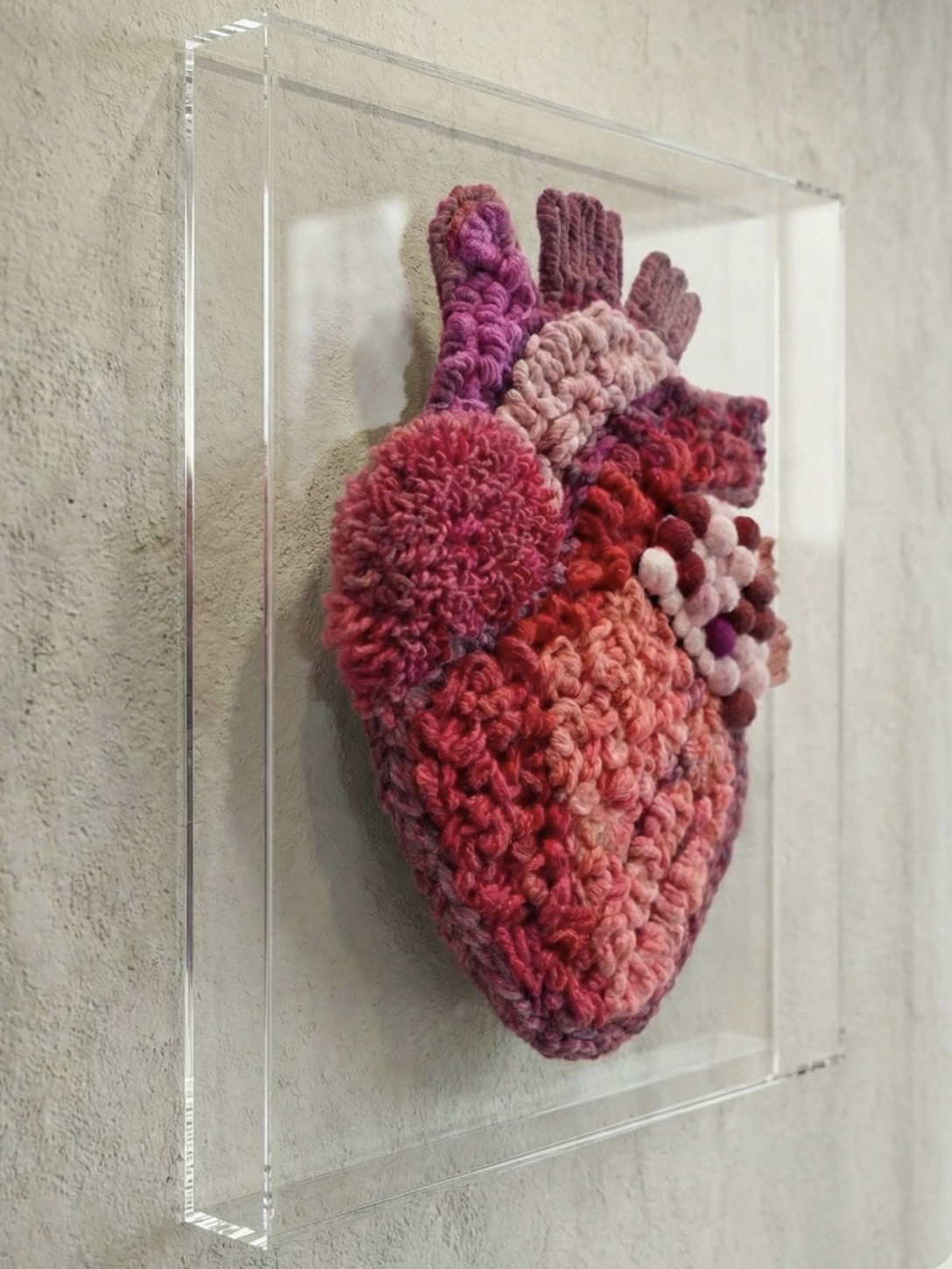 Painel Pulse Heart confeccionado com técnica de fiber art em cordões de algodão com diferentes texturas e espessuras. Com a Moldura em Acrílico a peça tem 35cm de largura x 35cm de altura x 3cm de profundidade. Tons de rosa, magenta, marsala e vinho se encontrando em camadas que parecem respirar.